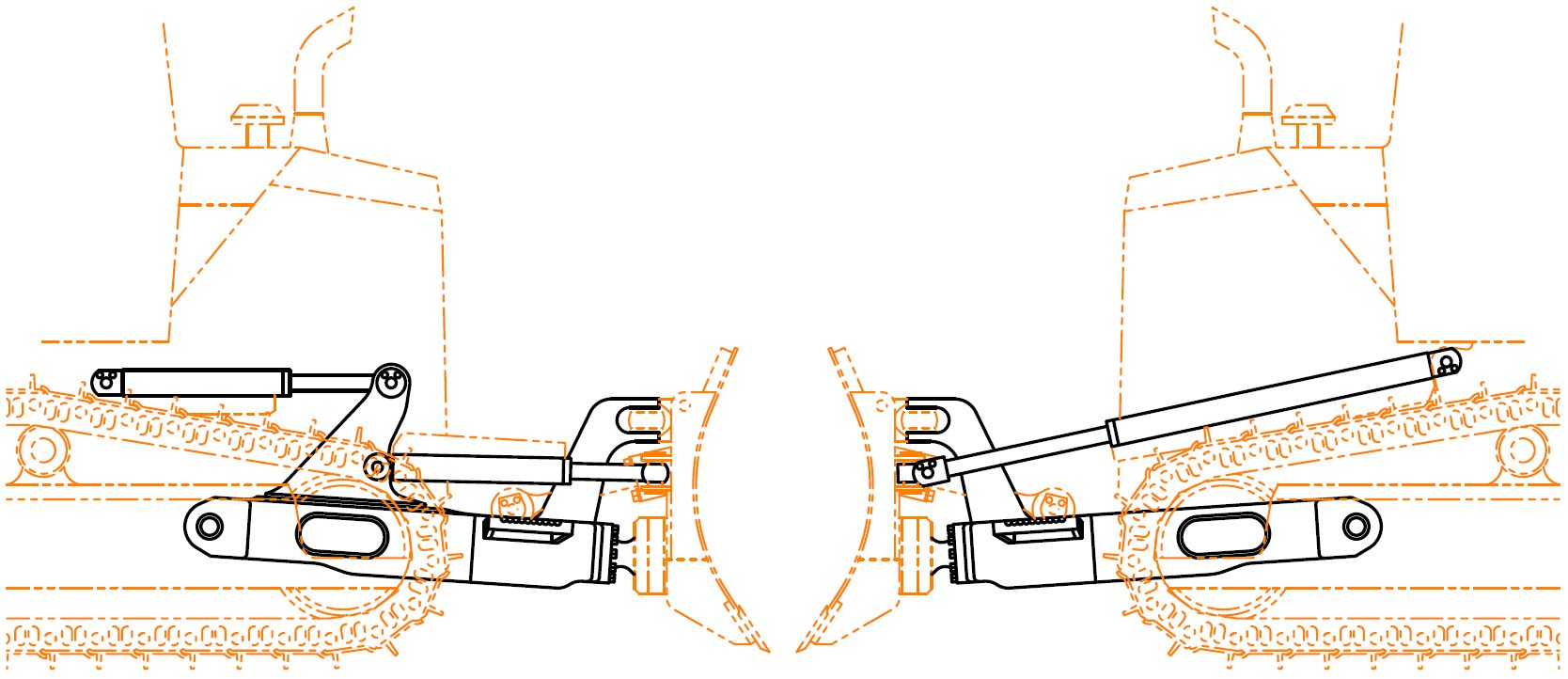 In the case of the DPAT, the maximum blade angle varies with blade lift. In fact, if blade movements were limited only by the open and closed lengths of the main actuators, no angle would be possible at either minimum or maximum height. To achieve blade angling at maximum lift, it is necessary to add an external stop between the C-frame and the tractor frame. External stops are installed on articulated wheel loaders and articulated off-road dump trucks to restrict the steering angle. Some mini excavators also use stops to restrain blade angle.